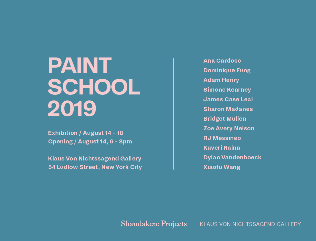 Shandaken Projects will present an exhibition of work related to its free educational initiative Paint School from August 14 to 18, 2019, at Klaus Von Nichtssagend Gallery, 54 Ludlow Street, New York, NY.