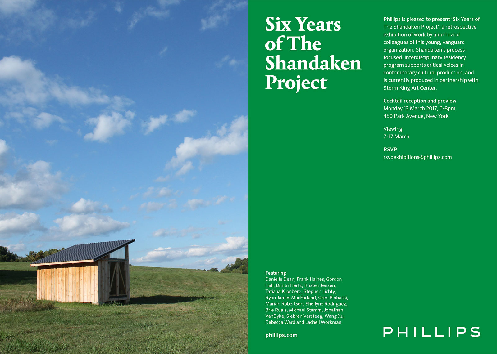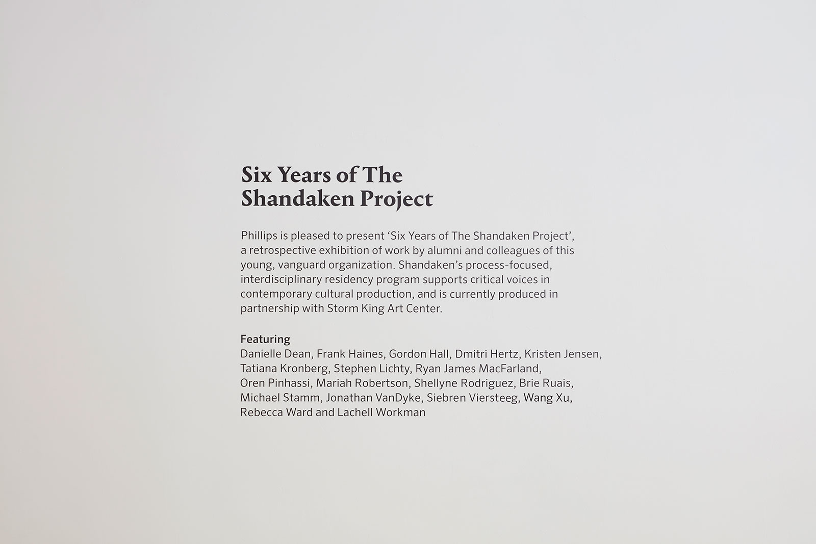 Phillips is pleased to present Six Years of The Shandaken Project, a retrospective exhibition of work by alumni and colleagues of this young, vanguard organization. Shandaken's process-focused, interdisciplinary residency program supports critical voices in contemporary cultural production, and is currently produced in partnership with Storm King Art Center.