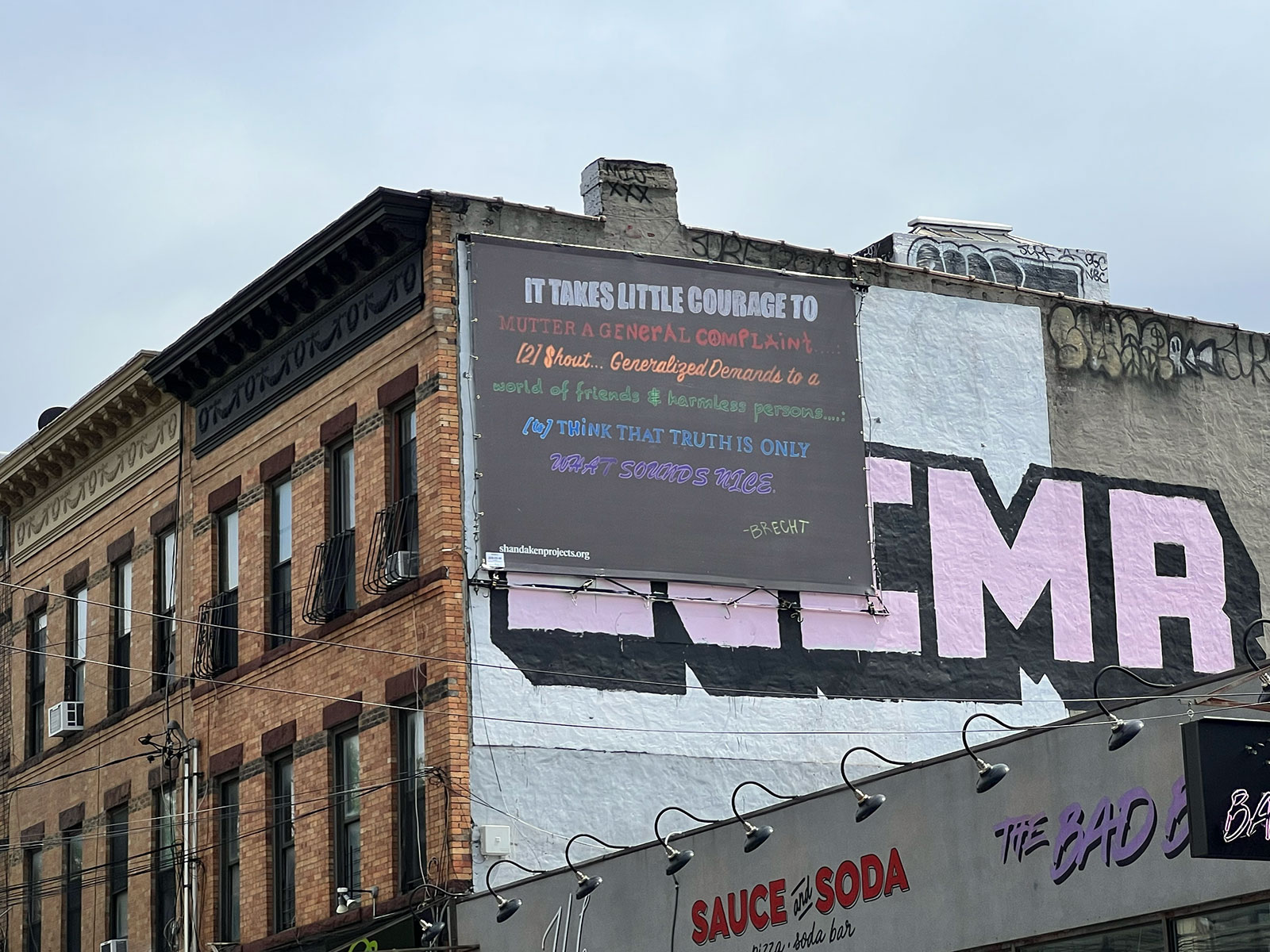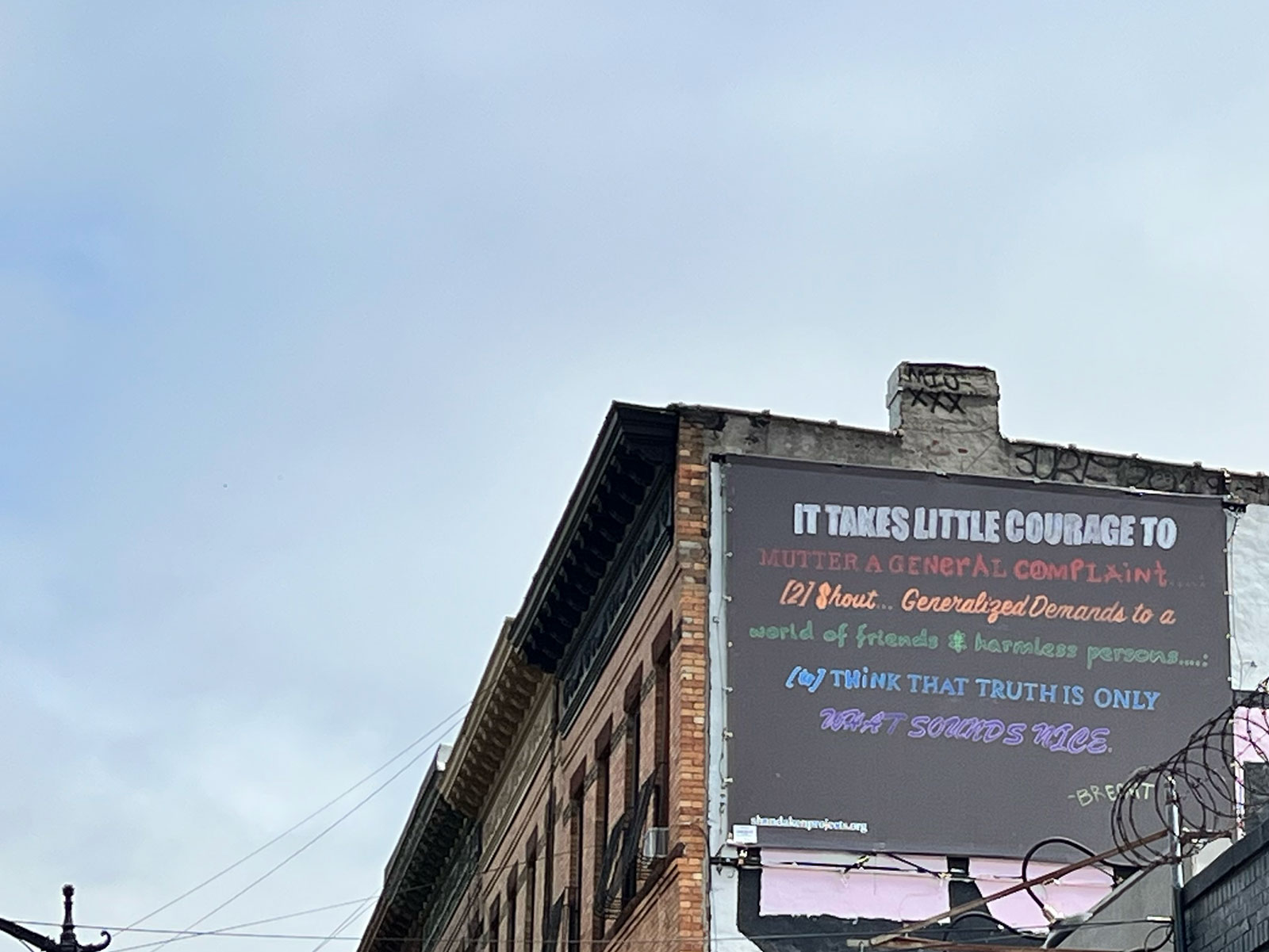 The first yard sign to feature the text “In this house we believe..." was made by Kristin Garvey, a Wisconsin woman, the day after Trump was elected president in 2016. The sign went viral, and Garvey set up mechanisms for sale proceeds to support ACLU. When production management became too large a task, responsibility for the sign and receipt of its proceeds were gifted to the Wisconsin Alliance for Women’s Health. Soon, knockoffs flooded the market, enriching individuals through their sale. Marable's work reproduces Bertolt Brecht's "Writing the Truth, Five Difficulties" in the style of these signs.
