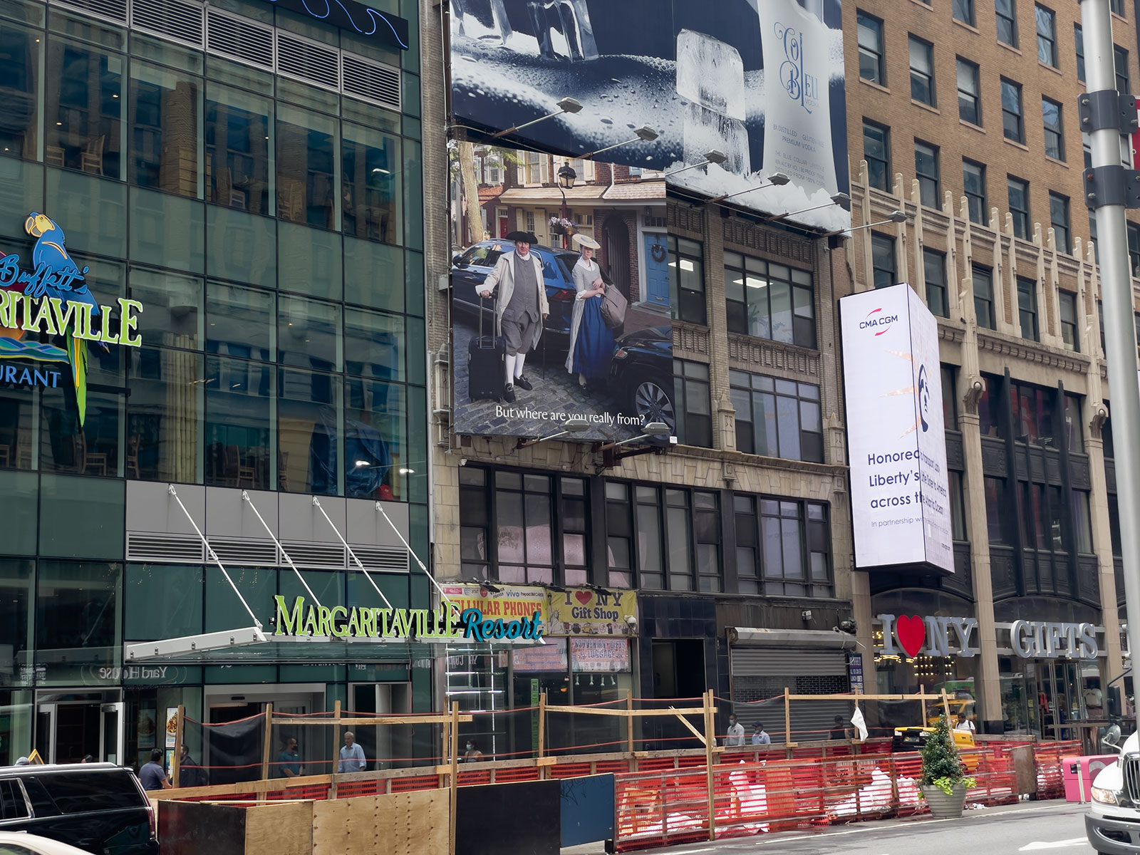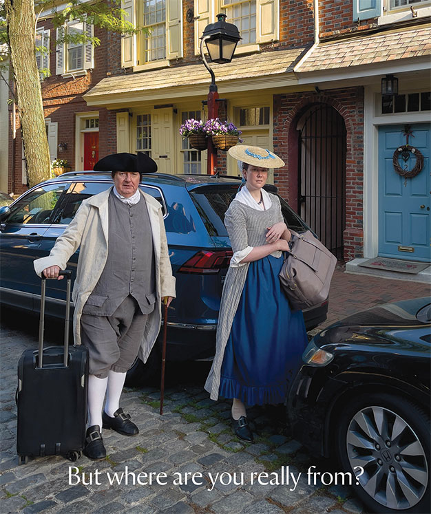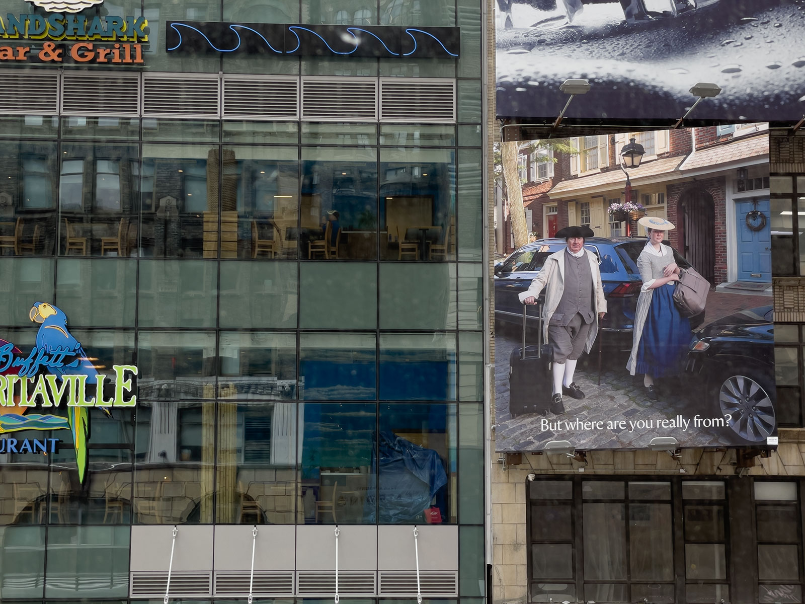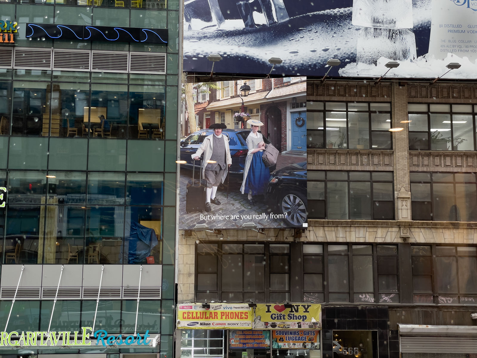 Shandaken Projects is pleased to announce the inauguration of a new public art initiative, Shandaken: 14x48. This program debuts with a commission from Josh Kline in partnership with billboard company Lamar. Kline’s new work poses a question to the public that the artist—who is of mixed-race and whose mother was an immigrant from the Philippines—has encountered throughout his life: “But where are you really from?” The work contrasts late-18th Century American costume and architecture with anachronistic artifacts from the 21st Century like SUVs and rolling hand luggage. Historical reenactors photographed on the streets of Philadelphia’s historic, colonial center call attention to the irony of adopting anti-immigration stances in a country whose current population is only 2.09 percent indigenous.
