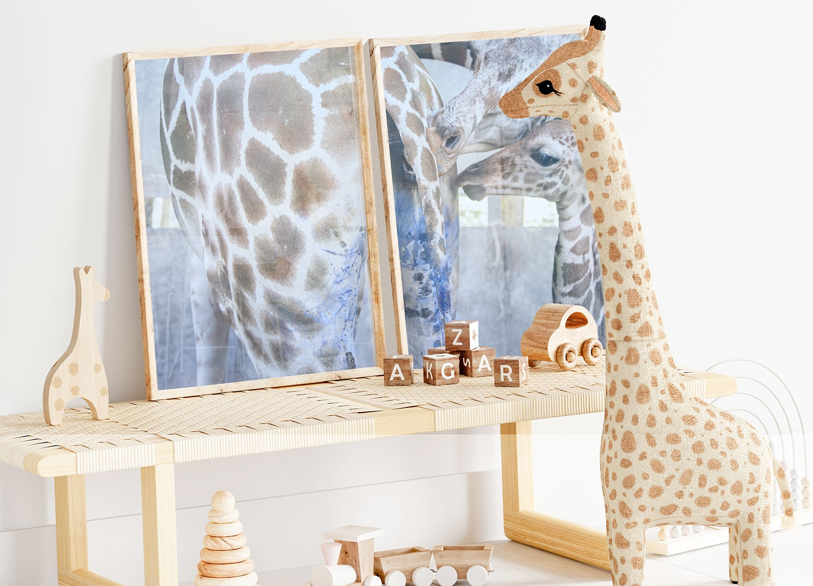 In a beige, sparse room, a stuffed giraffe is positioned close to a framed diptych of a mother giraffe and her newborn calf. The toy's gaze is focused on the artwork, its own image, distorted by its closer relationship to truth, reflected back. In contrast to the toy’s clean, sealed body, the photorealistic giraffe and her son are players in an abject scene, the mother still bleeding in her newly postpartum state. Her red blood has been replaced by a blue liquid, like that which is used in advertisements as a substitute for bodily fluids like urine or menses. The viscera offers the brightest color in the image: it is surrounded by the washed out, neutral tones of wood and rattan.